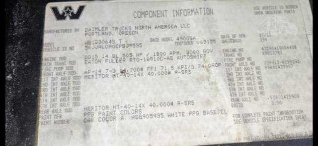 Truck Details: Year/Make/Model: 2012 Western Star 4900SA VIN: 5KJJALDR0CPBJ9535 Mileage: 362,000 miles (low miles for year) Engine: Detroit DD15 14.8L – 505 HP Transmission: Eaton Fuller AutoShift Automated Manual (RTO-16910C-AS, 3-pedal autoshift) Emissions: DEF equipped Condition: Runs and operates as it should